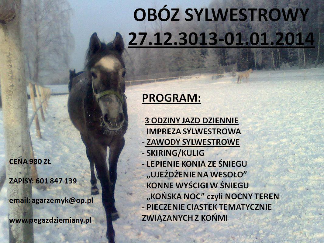 16 listopada 2013 In Aktualności Sylwester w OJ „PEGAZ” Ambitną młodzież, która chce wesoło i pracowicie spędzić okres świąteczno sylwestrowy zapraszamy na „Sylwester w siodle” do naszego Ośrodka. Poniżej program: