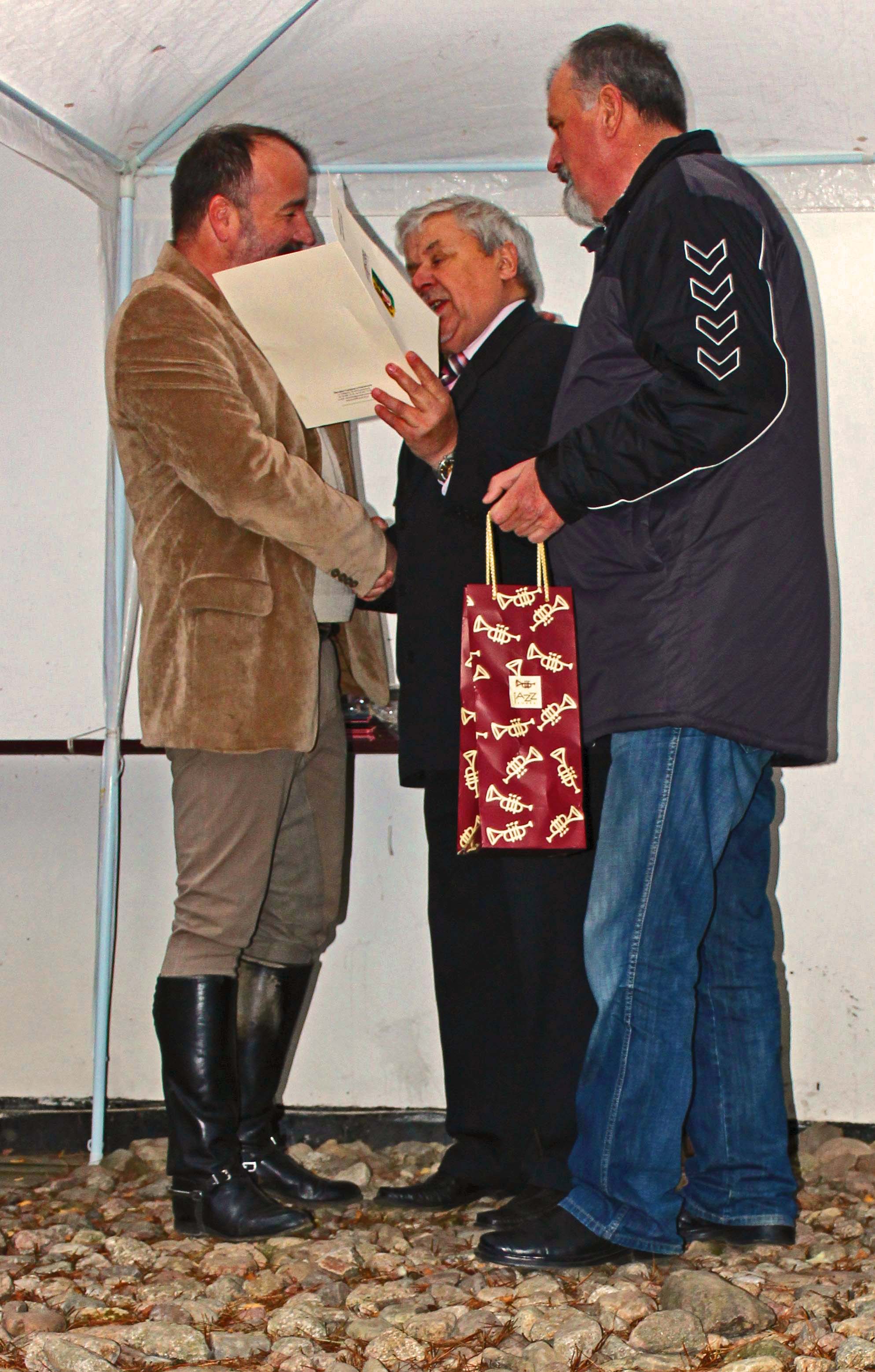 Następnie przyszła kolej na życzenia i gratulacje; w imieniu władz samorządowych na ręce Prezesa złożyli je: Starosta Zbigniew Stencel, Przewodniczący Rady Powiatu Józef Modrzejewski, Wójt Leszek Pobłocki, Radni Powiatu i Gminy, po władzach obejrzeliśmy składający życzenia roześmiany korowód reprezentantów klubów i ośrodków, zawodników, znajomych i przyjaciół.